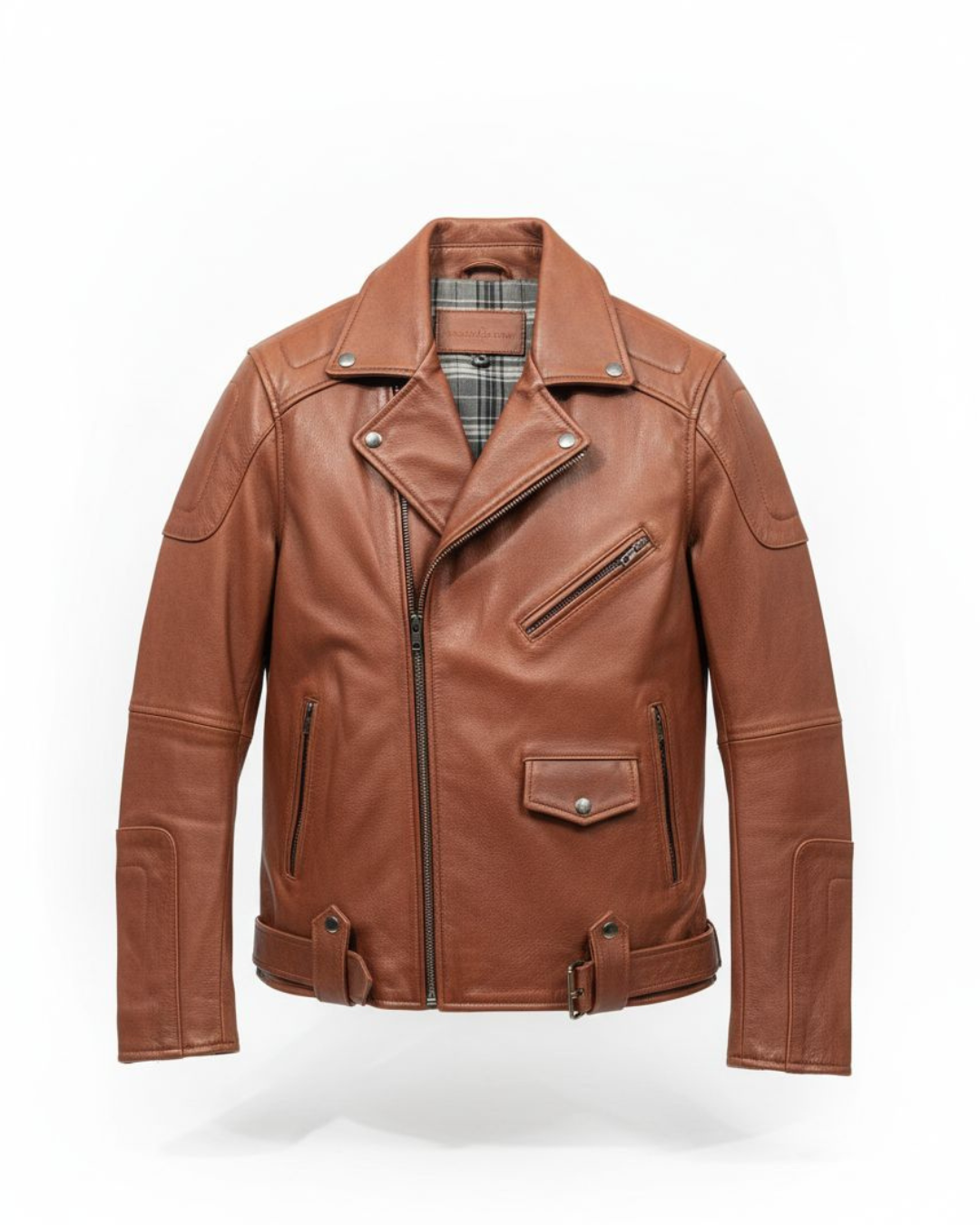 Crafted from 100% full-grain aniline leather, The Nomad Jacket brings together rugged durability and refined heritage styling. Featuring an asymmetrical moto design, quilted shoulders, plaid lining, and hand-aged cognac tones, it’s built to develop a rich patina and become your signature piece over time.